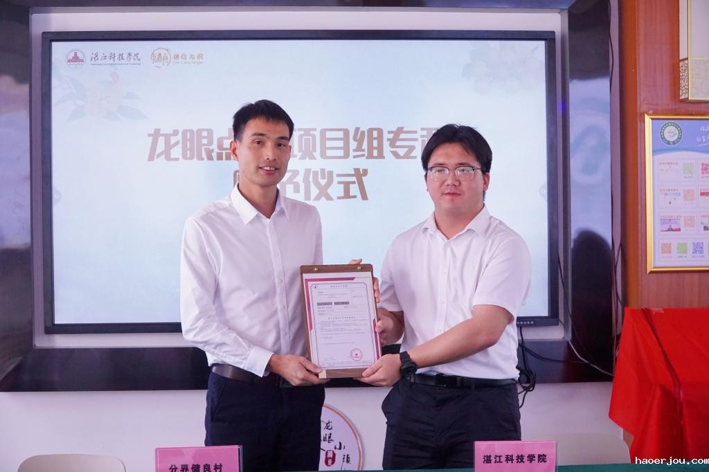 “龙眼点睛”项目的负责人许杰锋在活动中介绍了团队在农文旅融合方面的发展实践现状,并代表团队将项目目前申获的专利赠予储良村。赠予仪式后,学校和储良村签署了《农文旅融合产学研合作协议》,并共同为学校的“大学生创新创业实践教学基地”揭牌。
