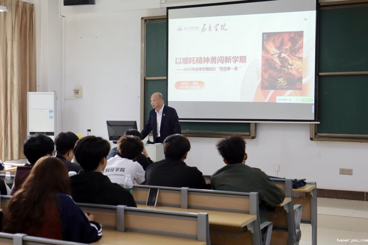 课堂上,莫院长以近期热映的电影《哪吒之魔童闹海》为教育素材,为同学们带来了一堂充满深度与启发的思政课。他激励同学们在遇到挑战时,要像哪吒一样,从不放弃,要学会“我命由我不由天”。