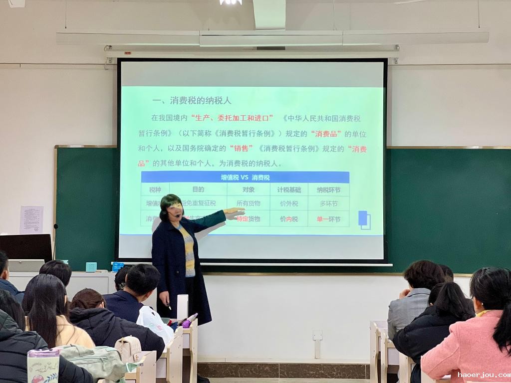 陈舒副教授以《税法》课程“消费税”章节为示范内容,以“纳税人”和“征税范围”为切入点,通过虚拟故事案例导入知识点,结合图表对比、情境模拟等方式,深入浅出解析消费税的征收逻辑。课堂中穿插随堂习题巩固学习效果,充分展现“讲练结合、学以致用”的教学特色。