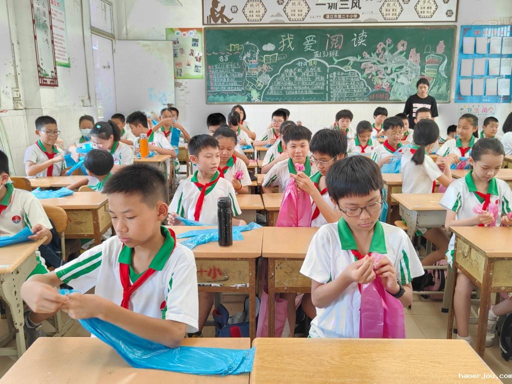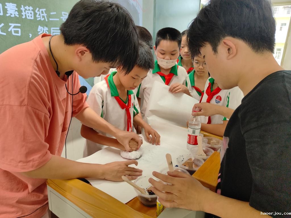“‘环保实践工坊’最受小朋友们欢迎。”卓燕苹同学说道。她向记者介绍,在实践教学环节,团队以生态艺术创作为载体,通过“白色垃圾变装秀”“植物拓染非遗体验”“化石拓印创作”等活动,选择贴近生活的环保材料,将环保理念具象化,从而引导小朋友们树立环保意识,强化责任感。“以专题六《漂浮的白色垃圾》为例。塑料袋、一次性餐具、矿泉水瓶等都是小朋友们最熟悉的白色污染垃圾。”作为课程主讲人,吴悦新同学认为,通过聚焦小朋友们熟悉的白色污染物品,引导大家在动手改造中理解废弃物再生价值,同时结合红树林保护等主题,能够进一步加深他们对资源循环利用与环境保护的认知。
