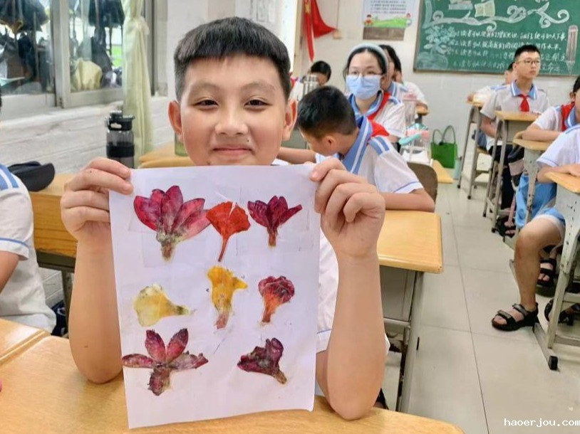 “生态环保教育不仅仅是知识的传授,更是一种生活态度的培养。”队长表示,希望通过课程,小朋友们能够学会从日常小事做起,减少污染,节约资源,也希望团队的行动能真正让环保理念“长”进未来。他指出,实践课程不仅专注于“变废为宝”的直观体验,同时也注重自然与艺术的融合、科普与艺术的融合。专题四《拓自然之美,播非遗之种》结合非遗技术“植物拓染”,利用锤子、胶带等工具将植物色彩与纹理拓印到布料上,让小朋友们产生了浓厚的兴趣。“课程设计的初衷是减少资源浪费的同时培养小朋友们对自然素材的敏感度,引导他们感受自然美学。”卓燕苹同学说道。