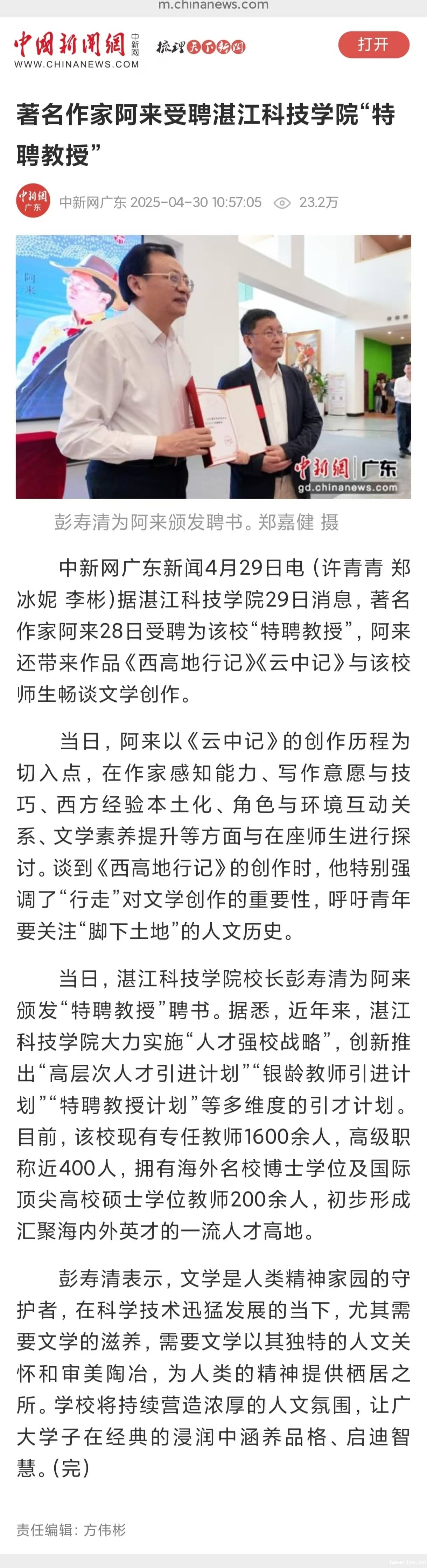 4月29日,中国新闻网刊载著名作家阿来受聘手机版伟德客户端下载“特聘教授”消息,具体链接如下: